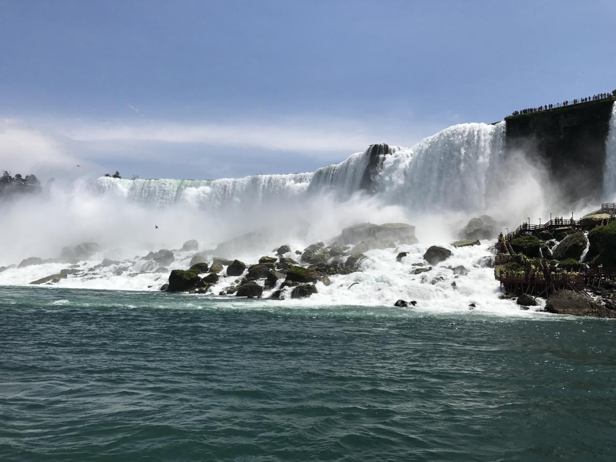 经过了四个半小时的颠簸,我们终于到达了目的地。作为著名游览胜地,尼亚加拉瀑布游人如织。在学长和学姐们的带领下,我们拿到了登上游船的船票,船票上印着的就是我们所乘坐的游船,可以近距离感受到瀑布的壮观。随着人流慢慢登船,远处目光可及的是美国与加拿大交界的彩虹桥。