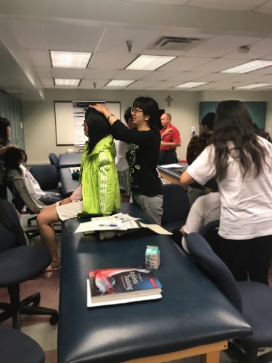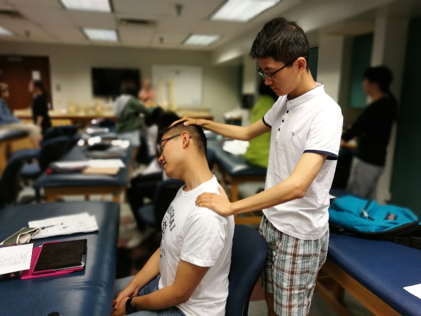 本周课堂上大家也随老师一同进行了操作的练习,一方面是对理论知识的复习巩固,另一方面也是因为Athletic Training和操作的熟练度密不可分。尽管对于英文课本上密密麻麻繁多复杂的词句,同学们已经通过在线APP下载教学PPT先进行了预习,但语言和专业的双重障碍仍是亟需克服的,相对来说,在老师的指导下相互练习更易理解。回想起护理基础学相互练习的日子,从那时的静脉注射到现在的神经功能评估,纵然内容不同,实践的重要却是异曲同工。