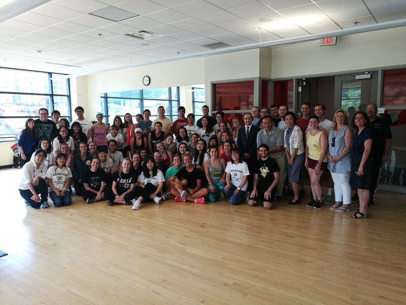 717日下午两点半,我们与美国的学生以及院内领导进行了中美文化交流,期间欢声笑语、欢乐融融。第一个项目是同学们依据学校武术比赛中的手指操改编的一小段团体操练,当主持人问美方同学有无兴趣一同练习时,美国同学纷纷举手,十分热情地加入了我们的团体手指操。院方老师跟着我们一起做,作为中美双方文化交流的开场,集体手指操快速将交流气氛调动起来,也拉开此次中国传统文化展示的序幕。