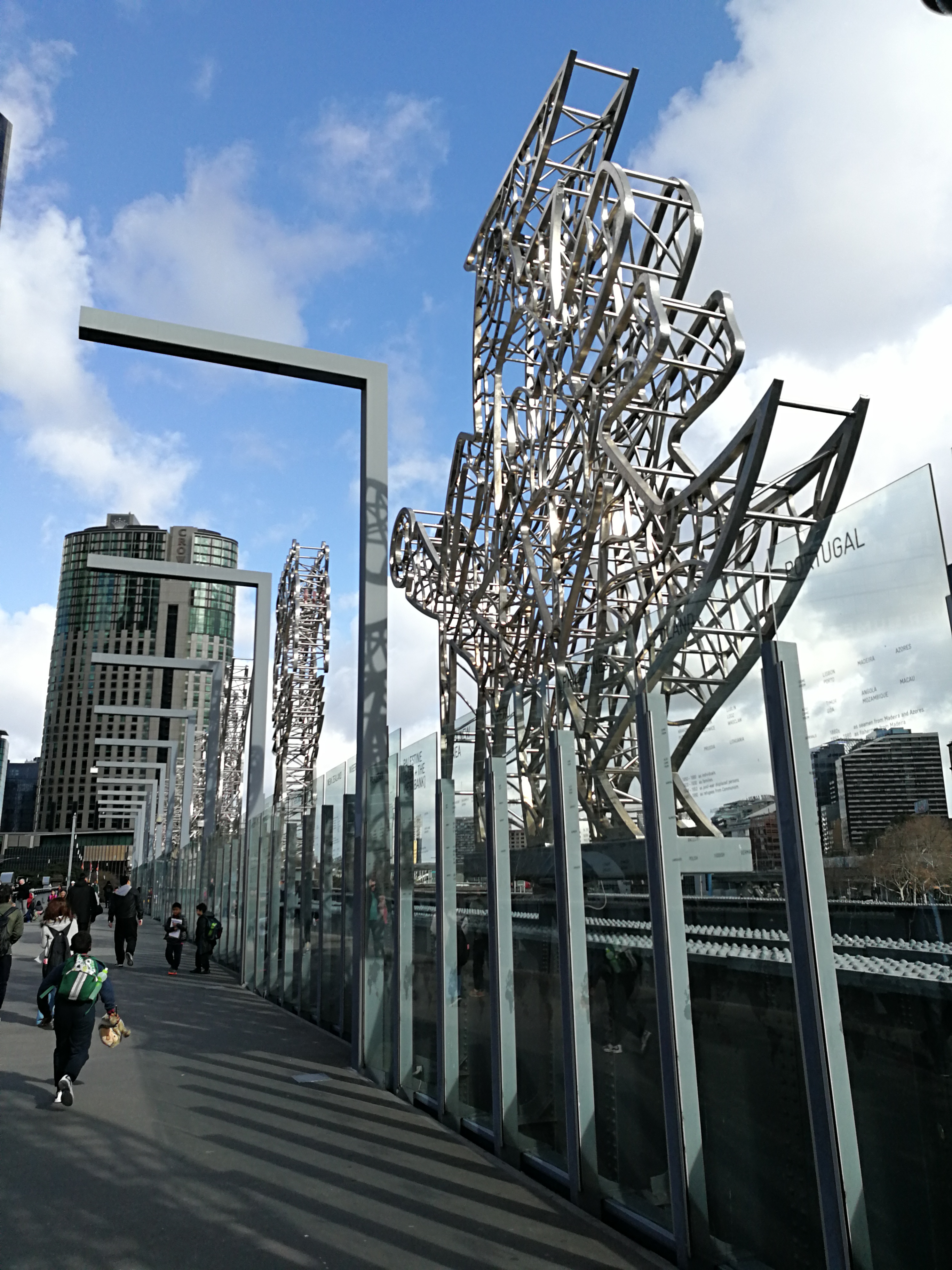 这是一座普通桥,却又是一座文化桥。走在桥上,除了欣赏岸边的美景外,更多被两边的文化墙吸引,一百多面看似透明的文化墙,上边却详细介绍了目前为止,一百多个国家来澳洲的总人数,之后详细介绍了不同时期的访客类型,不同的访客类型及其对应的人数,以及迁移人口之前国家所居住省份。不可谓不详细,快步寻找中国,近期访澳人口以旅游和学习居多,且近年有增长趋势,浏览着一面面文化墙,感受这世界地球村的变迁,感受这文化的交融,感受着中国的快速崛起,无疑是一堂生动形象的历史课。