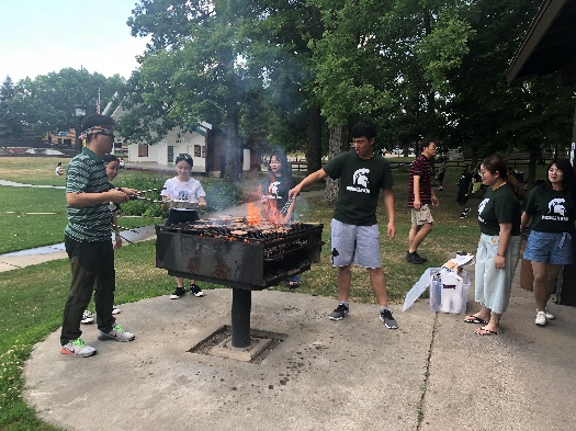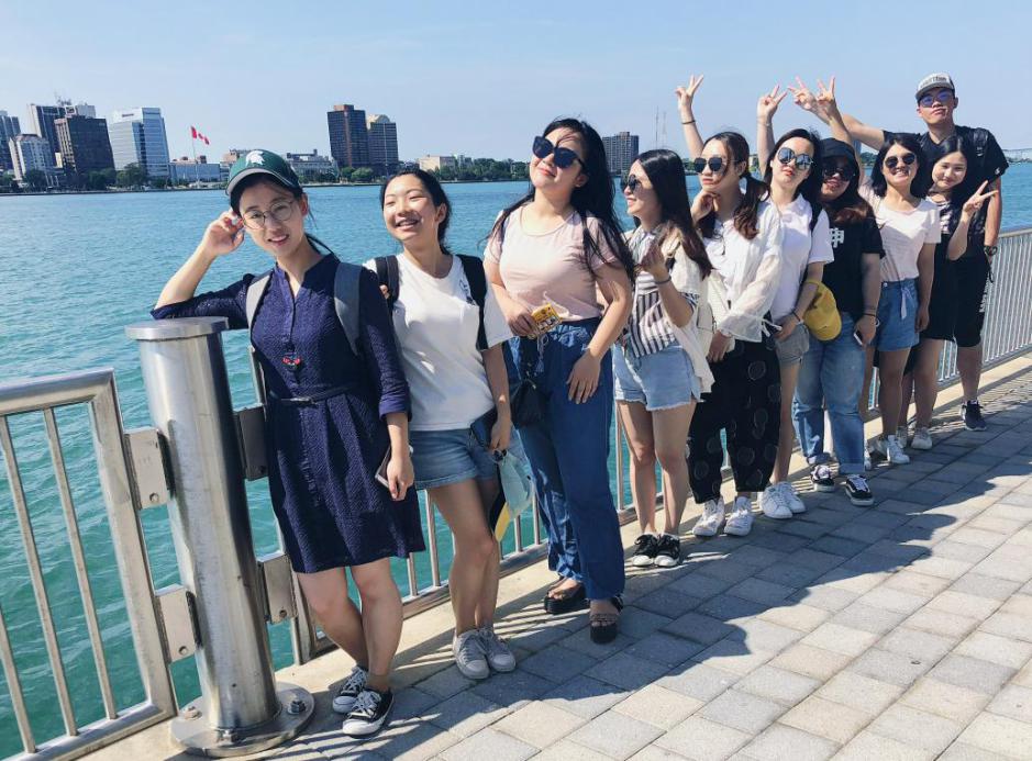 72日上午,我们上了在MSU的最后一节英语课。Austin老师最后一次指导我们如何写paper和进行presentation,并他对各个小组逐个进行认真指导。在课程的最后,Austin给我们唱了一首他当时留学毕业时自己写的歌《Goodbyemy friend》,并且不忘挖空填词来让我们进行听力练习,在动听的吉他扫弦声与悦耳的歌声的伴随下,我们的课程画上了完美的句号。这一周除了课程的结业,还有许多的外出活动。例如周二我们驾车前往了底特律,并在底特律河畔漫步,它是美国与加拿大的交界河,隔岸就可以看到加拿大,在阳光明媚与水天一色的风景前,我们留下了合影。周三我们去了东兰辛湖进行户外烧烤,在老师的带领下,大家各自分工,帮忙烤肉、切水果和蔬菜。吃完饭,大家便相约着去湖边看一看。踩着细细的软沙,感受水波从脚底划过的惬意感,大家的心情都放松了下来。
