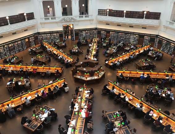 “一个城市可以没有高楼大厦,却不能没有图书馆。”公共图书馆可以说是一个城市的文化名片。我们一行人去了澳大利亚最古老的公共图书馆――维多利亚州立图书馆进行了参观,虽然里边有很多的游客,但是游客和阅读者互不干扰。图书馆内的建筑古典而又素朴,最令人印象深刻的是三楼的阅览室,它的圆形拱顶非常气派,玻璃制的顶使得整个大厅阳光充足。长条形阅读桌由穹顶中心向四周放射排放,由高处望去蔚为壮观。在这里,不仅能体会到墨尔本的文化气息和深厚底蕴,又能感受到现代文明与历史艺术的交融,我们的内心便自然地沉静了下来。