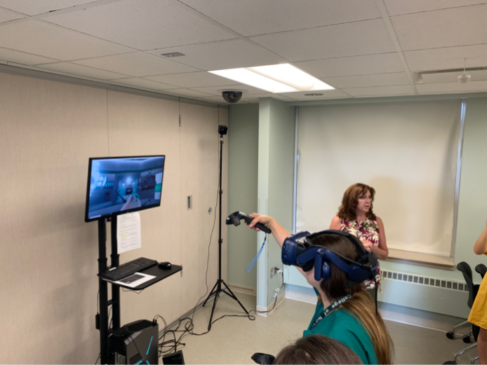 8月2日上午,美国访学团成员们前往密歇根州立大学整科医学院学习评估中心(Learning Assessment Center)进行实地参观。在负责人Mary的带领下,同学们先是来到了模拟病房,1:1还原医院病室环境,模拟病人拥有生命体征,可以进行静脉注射等一系列临床治疗,让学生充分锻炼自己的实践操作。值得一提的是,评估中心将VR技术引进至教学过程中,逼真的场景设计让学生们身临其境。手术操作、耳朵内窥镜检查、眼底检查、腹腔B超等一系列专业性极高的技术操作,同学们可以反复进行实践训练——这一点恰恰是国内医学院校所欠缺的。中国应届医学毕业生普遍在临床显得技术生疏,而将VR技术作为教学工具可以很好地解决这一问题并提升学生的操作技能。