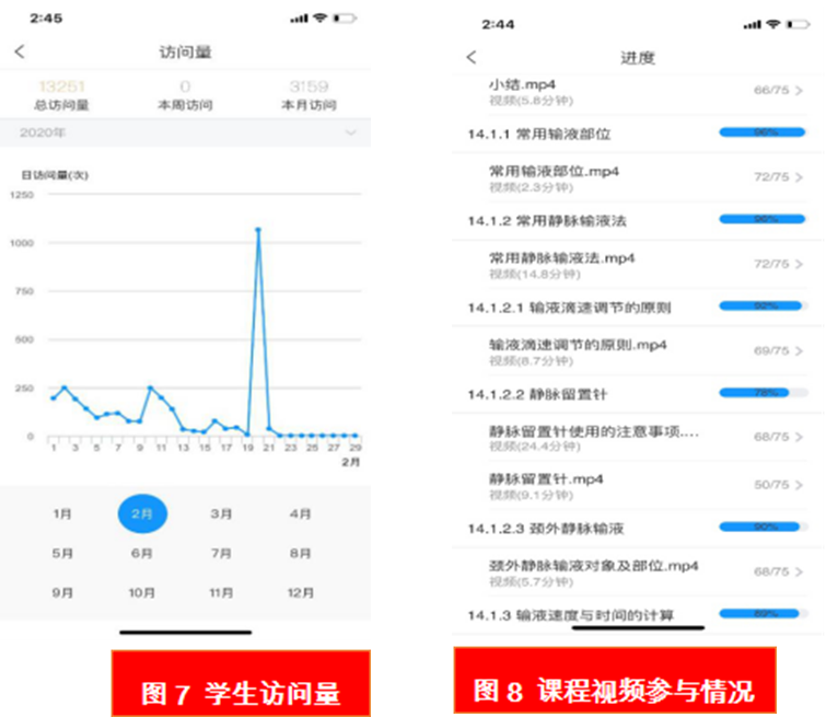 学生学习行为活跃,课程视频点击率高(图7-8),教学运行整体平稳,学生参与度高,作业完成率高。