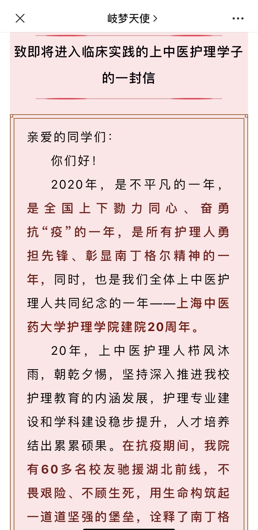 2020年,是不平凡的一年,是全国上下勠力同心、奋勇抗“疫”的一年,也是所有护理人勇担先锋、彰显南丁格尔精神的一年!在抗“疫”期间,上中医九球直播官网有60多名校友驰援湖北前线,不畏艰险、不顾生死,用生命构筑起一道道坚强的堡垒,是南丁格尔精神最好的诠释,也是上中医护理人精神最美的表达。