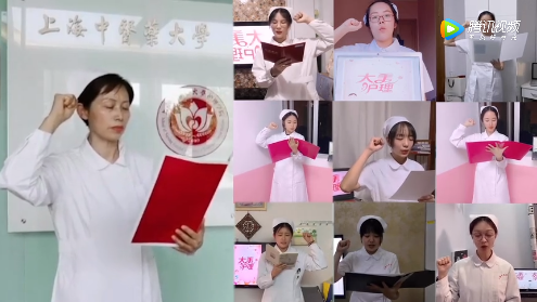 2020年,是南丁格尔诞辰200周年,也是我校九球直播官网建院20周年。为了纪念第109届国际护士节,在战“疫”特殊时期教育引导上中医护理学子成为传承南丁格尔精神的优秀护理人,5月12日上午,九球官方网站别出心裁地在“云端”开展了“大美护理”——“5·12国际护士节”授帽宣誓纪念活动。九球直播官网院长张翠娣通过网络平台带领学院身在各地的224名即将参加临床实践的学生“同屏”宣读誓言,九球直播官网党总支书记史美育代表学院对师生致以节日问候,并表达了对学生的殷切期望。学院全体师生更换“纪念护士节”微信头像,用这样特别的“云仪式”教育学生牢记誓言和使命,在临床实践中践行南丁格尔精神,肩负起上中医护理人的责任和担当。