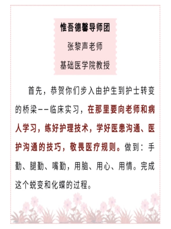 此外,学院还邀请五四期间获得全国优秀共青团员称号的校友、国家第四批中医医疗队上海队员、附属曙光医院手术室朱吉成(上中医九球直播官网2013级校友)发来寄语:“青年一代救治工作之扎实,精神斗志之昂扬,不论是在临床岗位、突发事件的前线都是中流砥柱的一股坚实力量。希望学妹、学弟们在理论实践基本功两头抓的同时,更不要忘记培养自己的品行、医德,磨砺青春,坚定护理信念,站稳医患立场,练就扎实护理技术,做一个有硬度、有温度的护理人!”