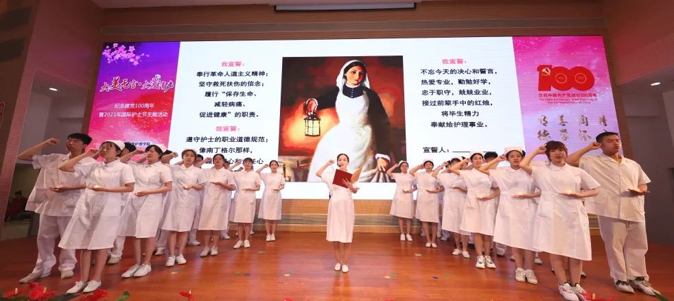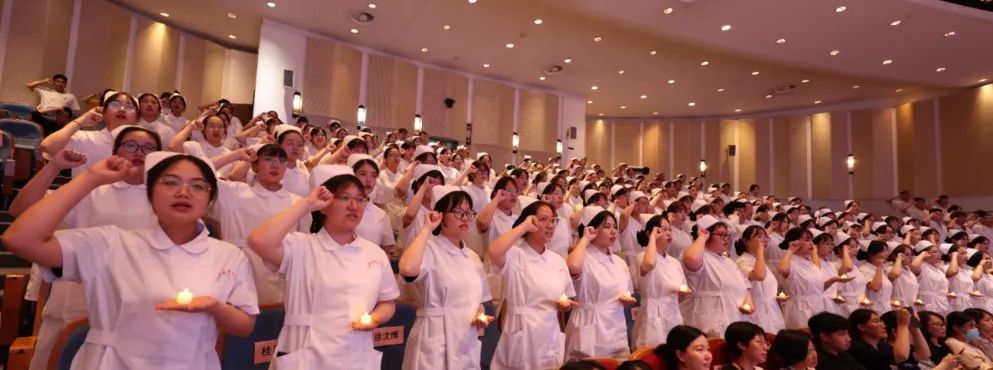 学史崇德,学史力行,护士节纪念大会上,九球官方网站附属医院护理部主任、九球直播官网教研室主任和抗疫校友代表为即将走入临床实习岗位的208名学生逐一戴上圣洁的燕尾帽。在甄暐的带领下,全场学生庄严宣誓。铿锵誓言在报告厅久久回荡,也在每一个护理人心上深深印刻。