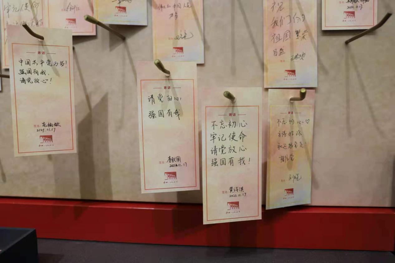 一大会址纪念馆基本陈列“伟大的开端——中国共产党创建历史陈列”共展出612件文物展品,它们真实的记录和展示了党和国家披荆斩棘勇往直前的发展道路,诠释着伟大建党精神 “坚持真理、坚守理想,践行初心、担当使命,不怕牺牲、英勇斗争,对党忠诚、不负人民” 的内涵。从泛黄的报纸到保存完好的旧照,以及先辈用过的旧衣旧物无一不让同学们感慨万千。同学们仔细瞻仰着,细细品味着一件件展品中铭刻的历史与辉煌,同时也对革命先辈为共产主义事业抛头颅洒热血的事迹有了更深一步的了解,最后同学们在离开时纷纷写下寄语,表达对先辈们的感恩和敬仰以及对未来的期许和愿望。