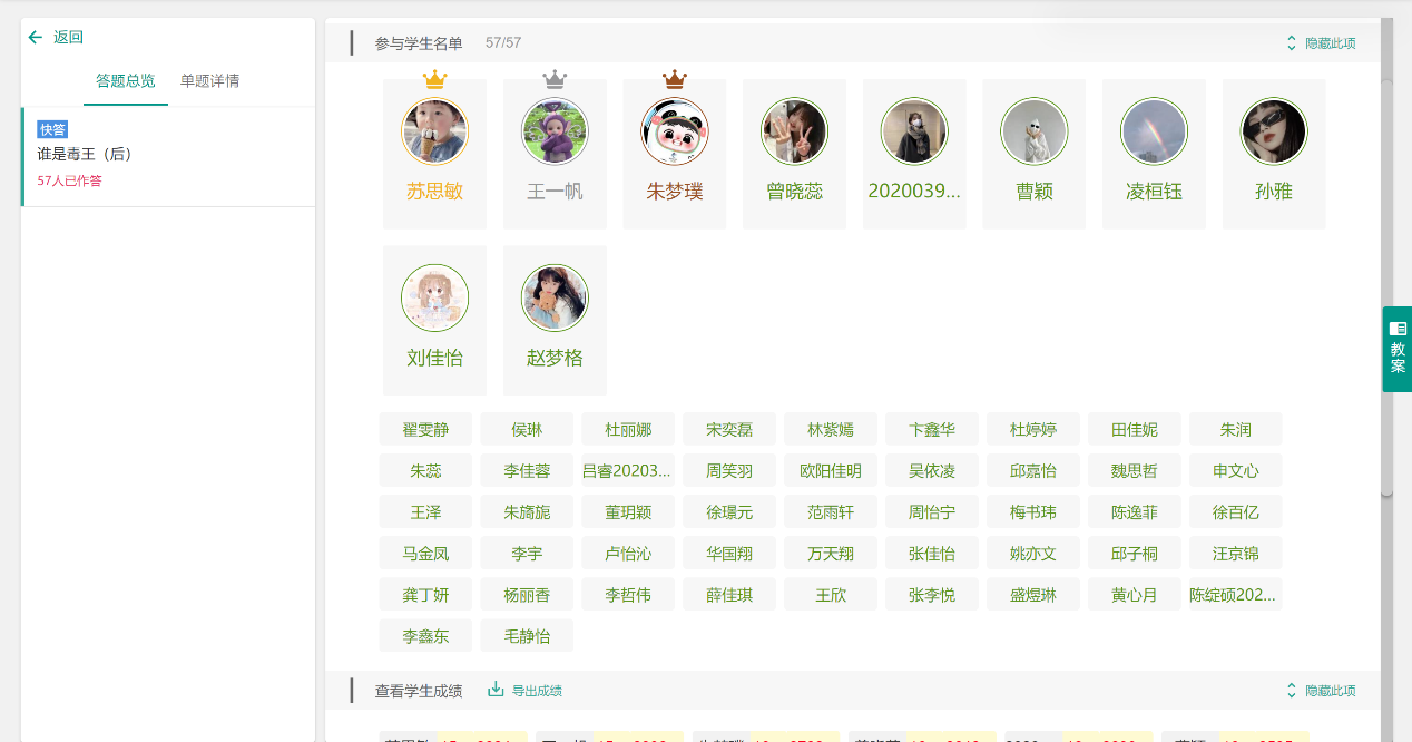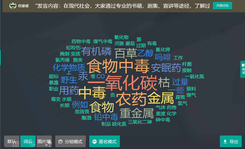 课前,授课教师程康耀在微助教公众号(OA)建立课程中心,借助微助教OA发起互动讨论来开展课前调查,并通过后台词云分析及观点墙进行反馈呈现;同时,利用微助教OA对学生发起限时竞赛答题(题量较少),学生运用已有的知识及翻阅书本回答问题。该步骤为教师更好地掌握学情和教学重点提供参考。腾讯会议直播教学时,教师一方面使用腾讯会议的即时聊天功能进行频繁的如判断、选择等形式的简短互动;另一方面,使用微助教OA进行抽答和抢答,并通过腾讯会议共享抽答和抢答的人员结果,被点到的同学开麦答题,模拟开展线下课堂的互动。课后总结方面。教师借助微助教OA的快问快答功能,如在急性中毒救治章节教师给互动取名为“谁是毒王(后)”,发起题量较大的快问快答,包括选择、判断和填空三种方式,每道题目根据难度可设置分值和限时,由57同学共同在同一限时内对每道题以竞赛方式开展快答,让学生检视自身知识掌握水平,查漏补缺。此外,教师还可借助作业、小组点评功能为学生布置课后作业。如教师提前上传课程相关的视频作业,学生通过手机登录公众号查看,观看时间需要达到70%,且完成点评任务才算完成作业。