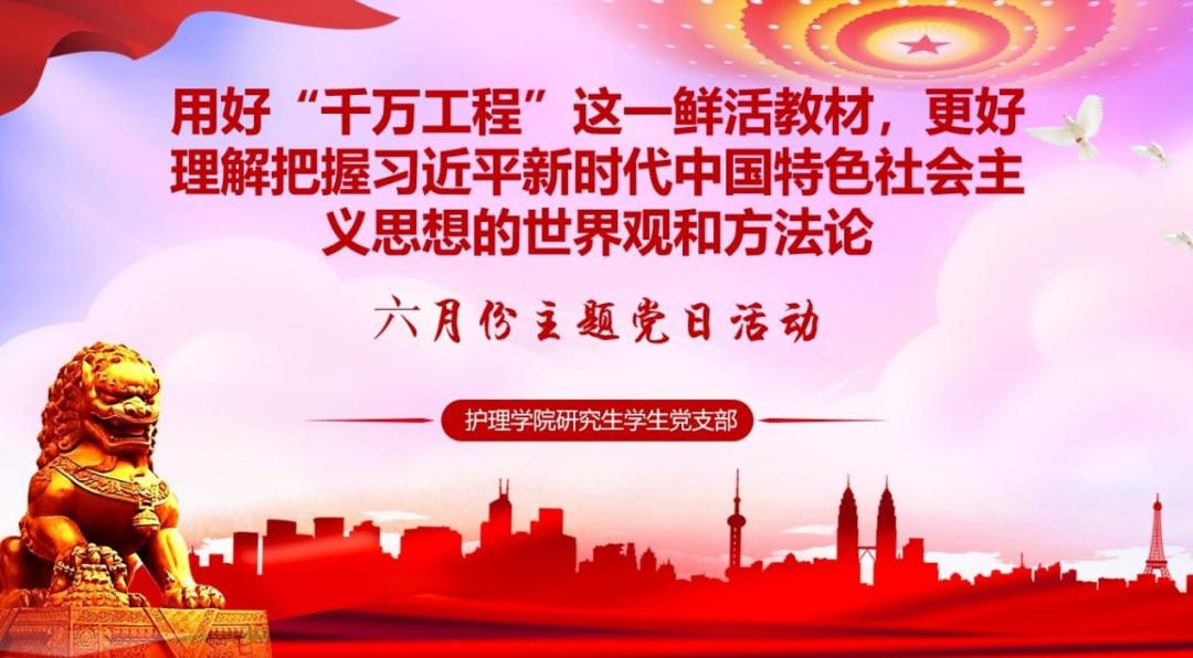 毕业生党员黄婪、王惠、李沪生、滕文哲结合自身研究生三年学习与生活体会对“千万工程”背后的七大法宝提出了学习感想,他们认为作为一名护理硕士研究生,坚持正确的研究方向尤为重要,而“没有调查就没有话语权”只有亲自深入临床一线调查才能找到正确的研究方向。